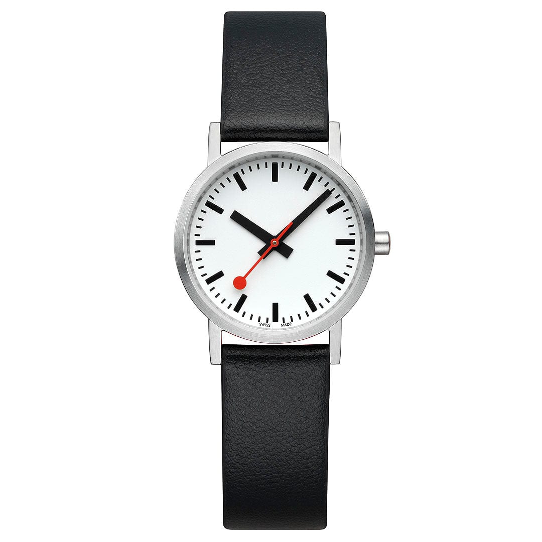 A perfectly balanced and sustainable design in its purest form. Part of the Classic collection, this timepiece showcases Mondaine’s signature minimalist design. It’s crafted with a 30mm brushed stainless steel case, a simple but beautiful white dial with no logo but the iconic red crown. The new vegan grape leather strap in black with a red lining is made from 75% plant-based eco-composites and 25% recycled PET.