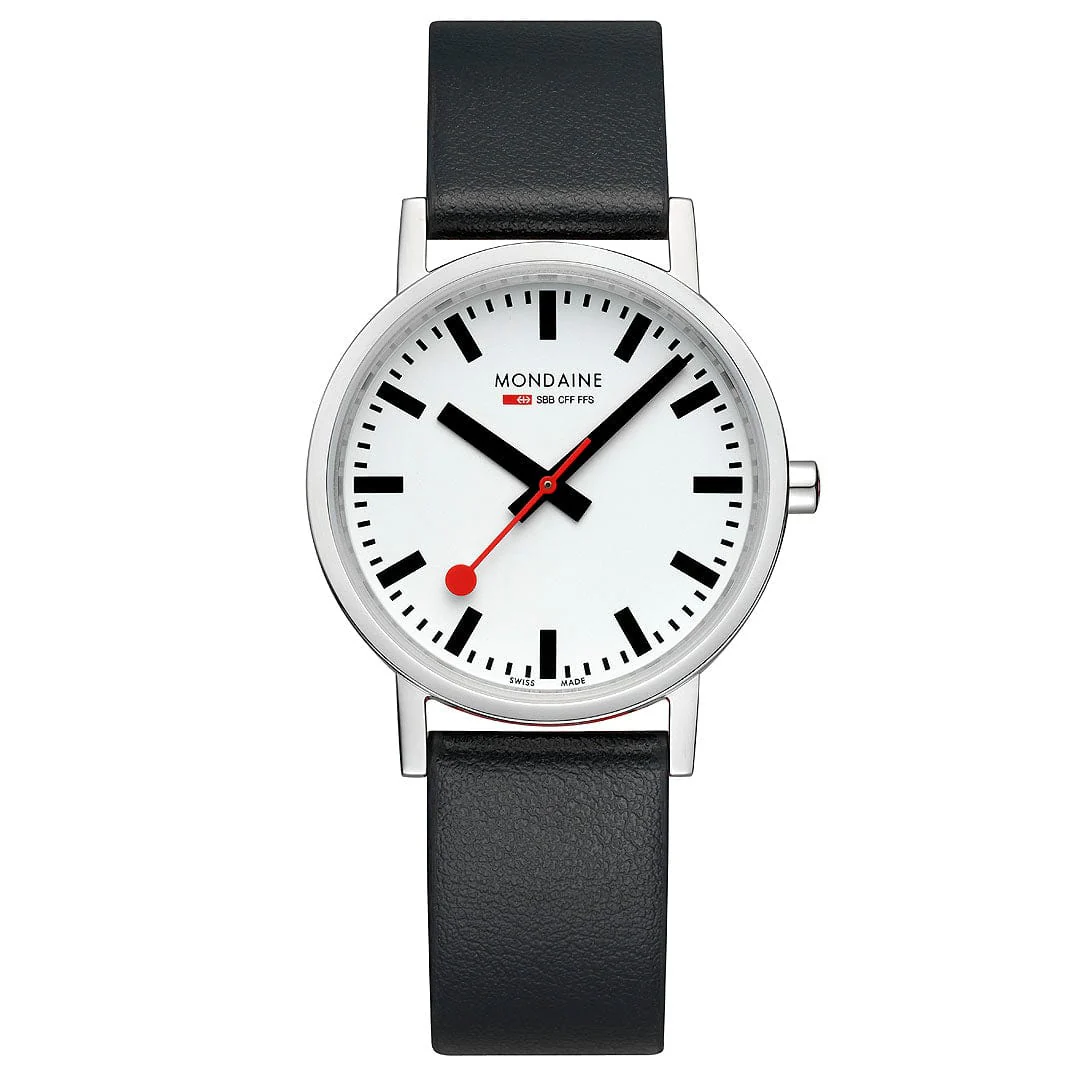 Dieser Zeitmesser aus der Classic-Kollektion zeigt das charakteristische minimalistische Design von Mondaine. Er verfügt über ein 36-mm-Gehäuse aus poliertem Edelstahl, ein schlichtes, aber schönes weißes Zifferblatt und wird von der ikonischen roten Krone geziert. Das neue vegane Traubenlederarmband in Schwarz mit rotem Innenfutter besteht zu 75% aus pflanzlichem Öko-Verbundmaterial und zu 25% aus recyceltem PET.