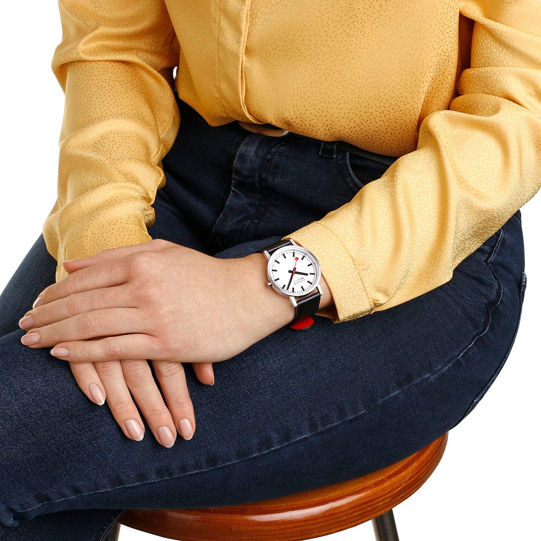 Dieser Zeitmesser aus der Classic-Kollektion zeigt das charakteristische minimalistische Design von Mondaine. Er verfügt über ein 36-mm-Gehäuse aus gebürstetem Edelstahl, ein schlichtes, aber schönes weißes Zifferblatt und wird von der ikonischen roten Krone geziert. Das neue vegane Traubenlederarmband in Schwarz mit rotem Innenfutter besteht zu 75% aus pflanzlichem Öko-Verbundmaterial und zu 25% aus recyceltem PET.