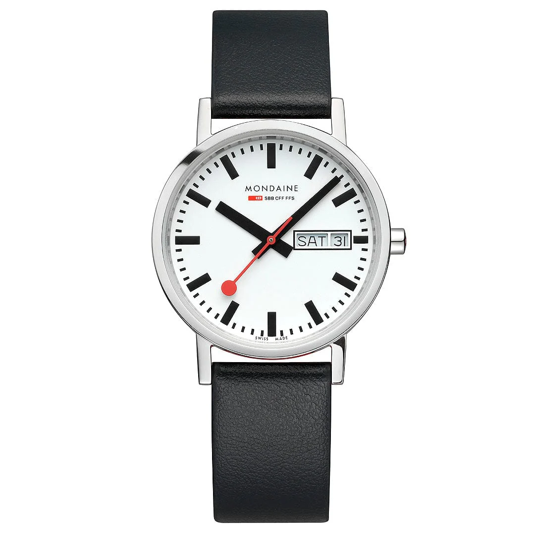 Dieser Zeitmesser aus der Classic-Kollektion zeigt das charakteristische minimalistische Design von Mondaine. Er verfügt über ein 36-mm-Gehäuse aus poliertem Edelstahl, ein schlichtes, aber schönes weißes Zifferblatt mit „Day and Date“-Funktion und wird von der ikonischen rote Krone geziert. Das neue vegane Traubenlederarmband in Schwarz mit rotem Innenfutter besteht aus 75% pflanzlichem Öko-Verbundstoff und 25% recyceltem PET-Material.