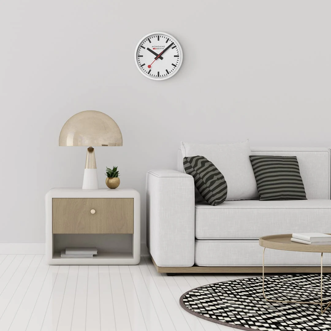 Diese offizielle Schweizer Eisenbahnuhr von MONDAINE ist eine echte Ikone des Schweizer Designs. Sie hat eine Größe von 25 cm und einen klaren, weißen, matten Aluminiumrahmen. Inspiriert von Hans Hilfikers legendärem Design aus dem Jahr 1944, verfügt diese Wanduhr über das sofort erkennbare minimalistische Zifferblatt, markante schwarze Zeiger und einen schleichenden, roten Sekundenzeiger für einen leisen Gang. Mit gehärtetem Mineralglas und staubgeschütztem Gehäuse verbindet sie Form und Funktion in perfekter Harmonie. Ihr klassicher Look passt in jeden Raum – von modernen Wohnungen bis hin zu professionellen Inneneinrichtungen. Diese Uhr ist mehr als nur ein Zeitmesser – sie ist ein Stück Designgeschichte.