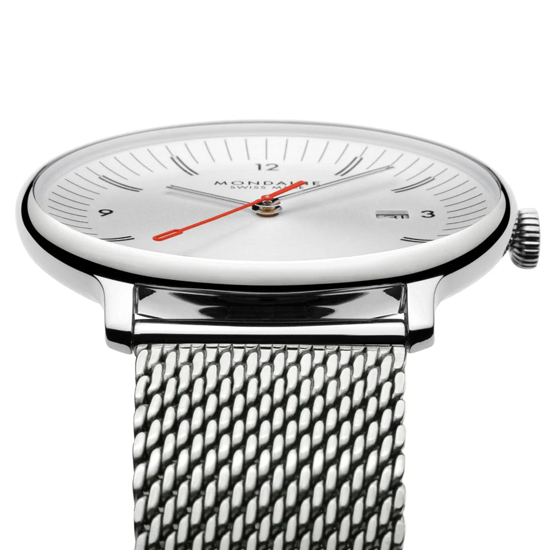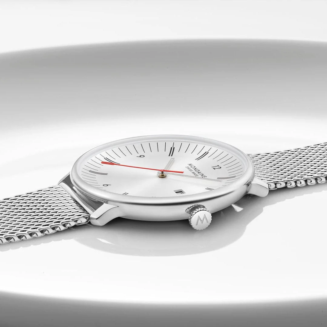 Auf dem Gehäuseboden ist das originale MONDAINE-Logo von 1951 eingraviert, das das reiche Erbe der Marke würdigt. Die Uhr wird von einem Schweizer Quarzwerk angetrieben und das Datumsfenster und die Wasserdichtigkeit bis zu 5 ATM verleihen dem Zeitmesser weitere, praktische Funktionalität.