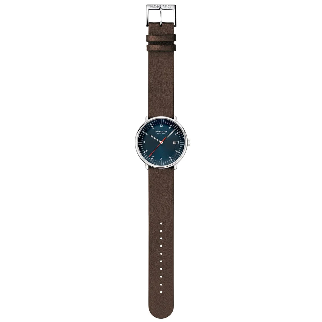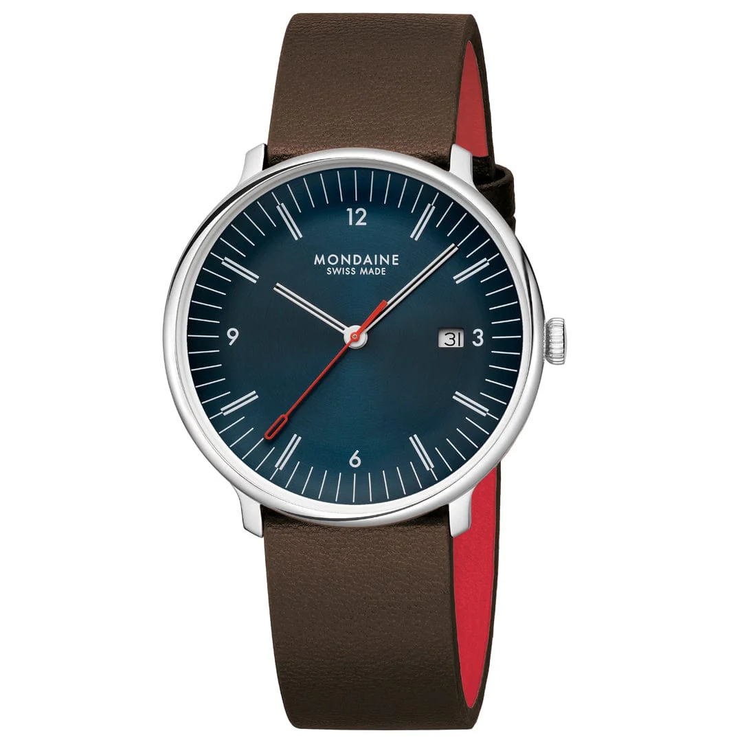 Die rote Farbe des Sekundenzeigers stellt eine Verbindung zur ikonischen MONDAINE Official Swiss Railways Kollektion her. Auf dem Gehäuseboden ist das originale MONDAINE-Logo von 1951 eingraviert, das das reiche Erbe der Marke würdigt.