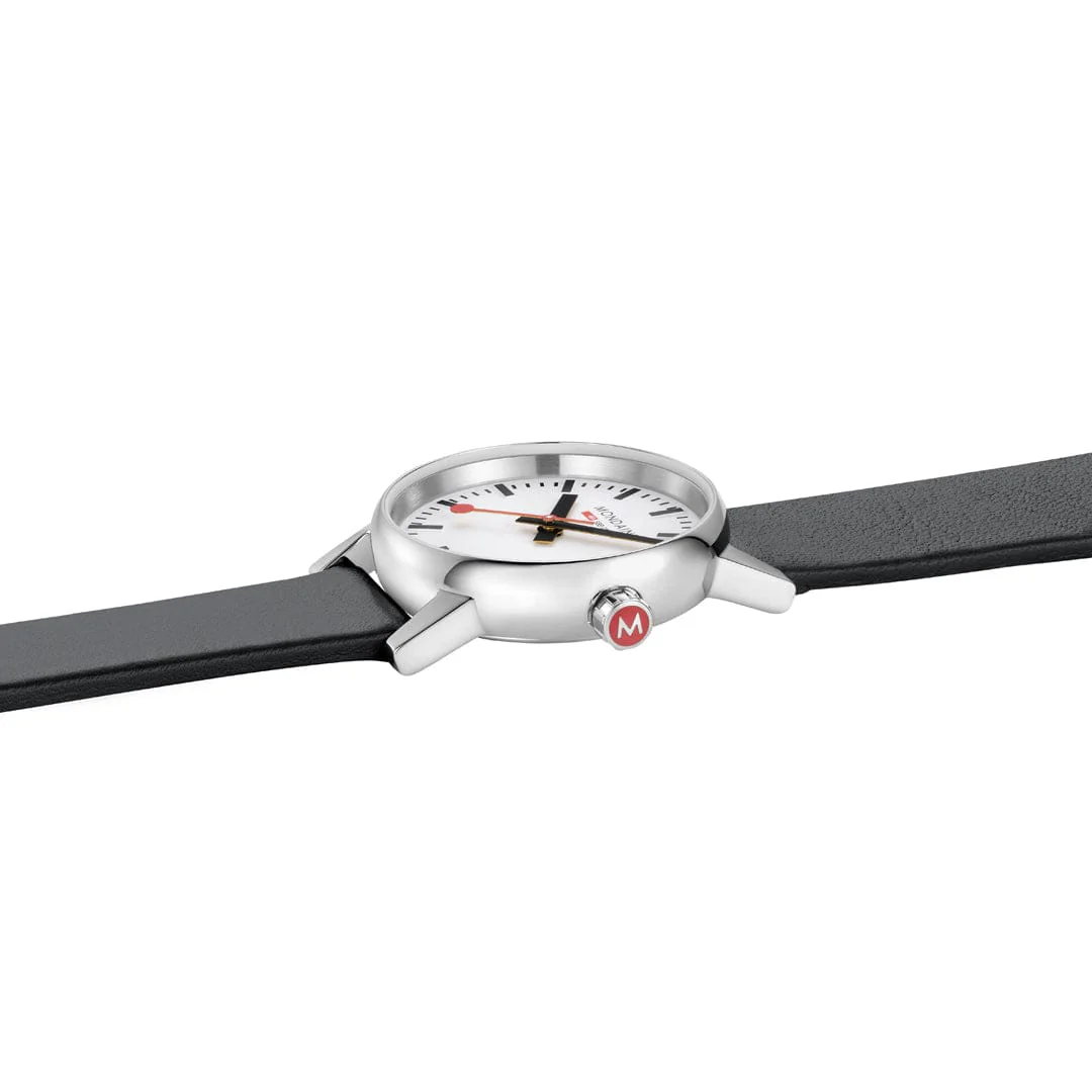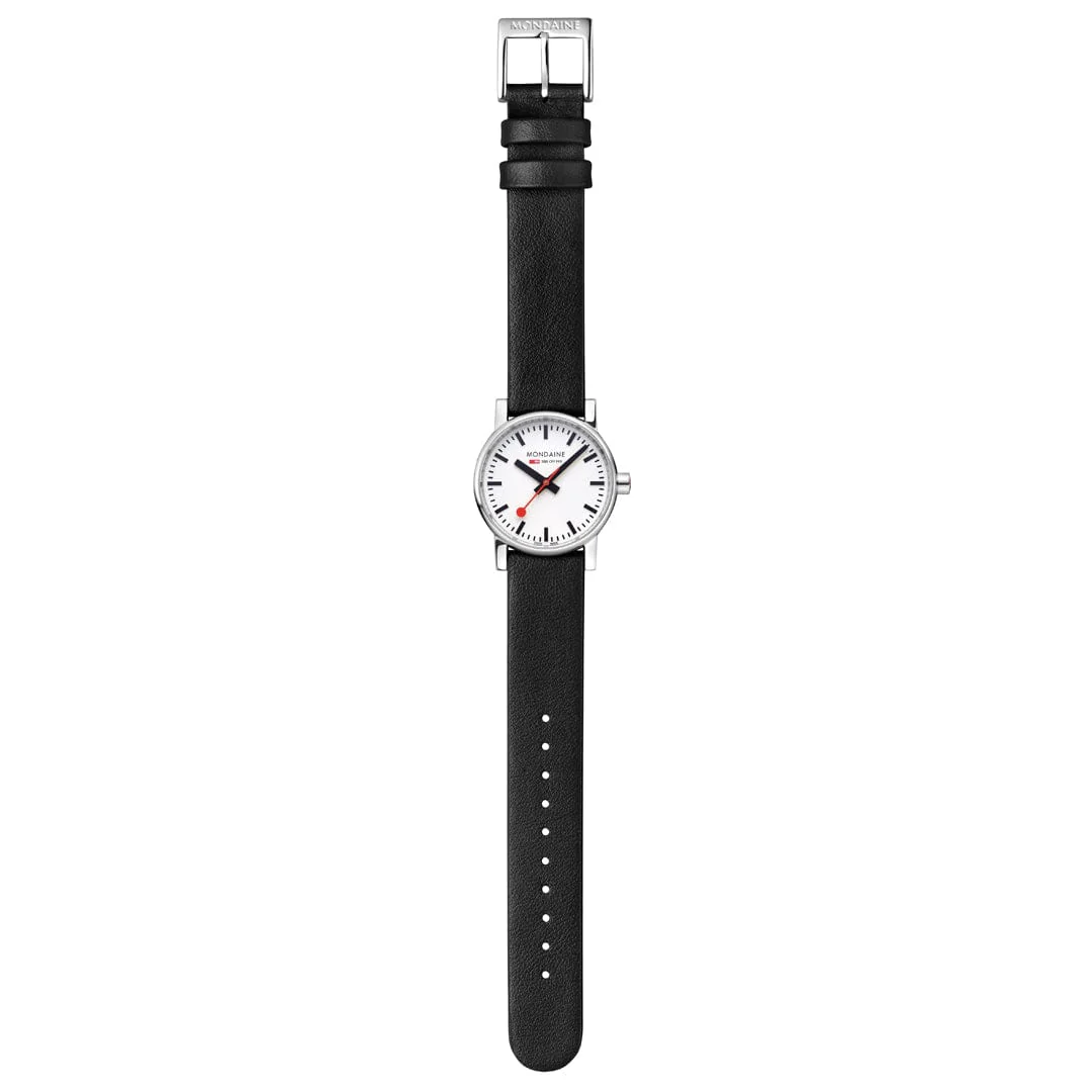 Die Evolution eines Klassikers. Das harmonisch geformte Gehäuse aus poliertem Edelstahl der Mondaine Official Swiss Railways Evo2 verspricht höchster Tragekomfort. Das kratzfeste Saphirglas schützt das Zifferblatt mit dem ikonischen Design der Mondaine Bahnhofsuhr und der markanten roten Kelle. Die ergonomische rote Krone und das vegane Lederarmband unterstreichen das Know-how von Mondaine. Letzteres besteht zu 75% aus pflanzlichem Öko-Verbundmaterial und zu 25% aus recyceltem PET.
