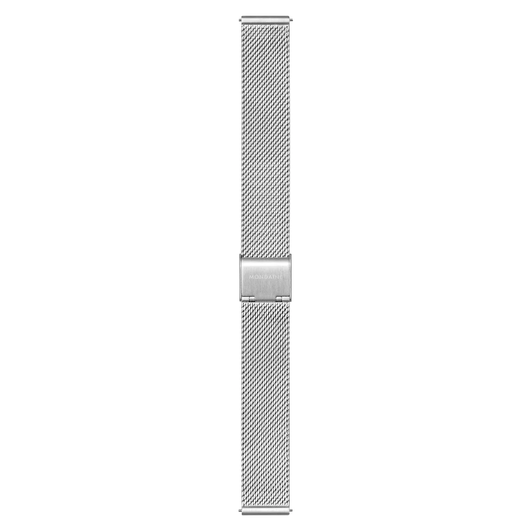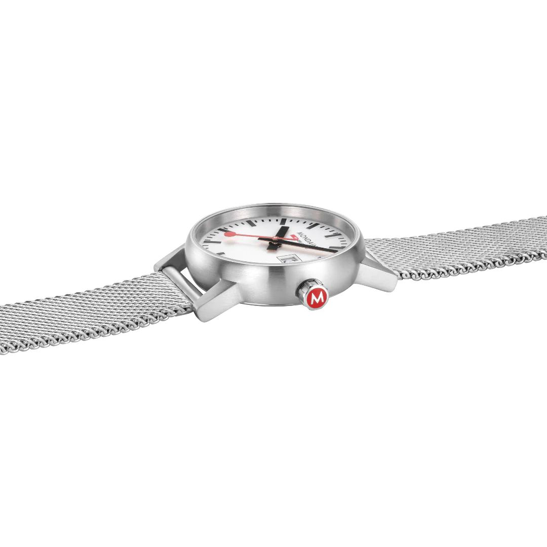 Evolutionäres Design. Das harmonisch geformte Gehäuse aus poliertem Edelstahl der Mondaine Official Swiss Railways Evo2 verspricht höchsten Tragekomfort. Das ikonische Design dieser klassischen Uhr zeichnet sich durch die gute Ablesbarkeit des Zifferblattes aus, was mit der grossen Datumsanzeige abgerundet wird. Das Milanaise-Mesh-Armband ist ein richtiger Blickfang.