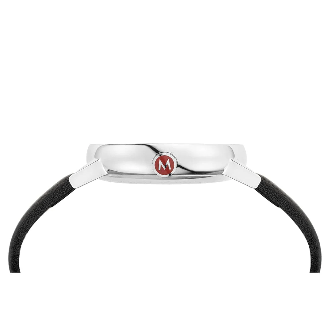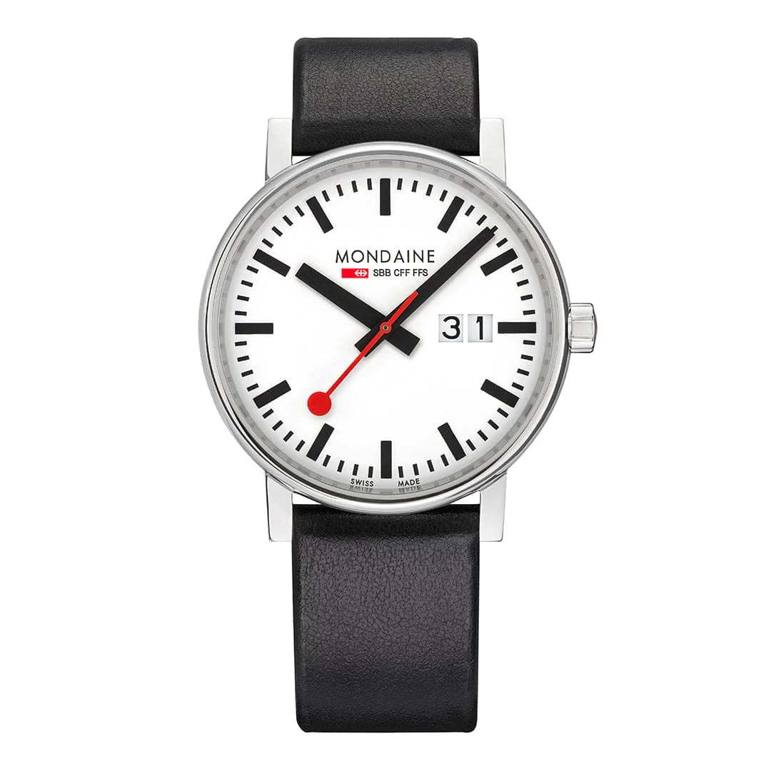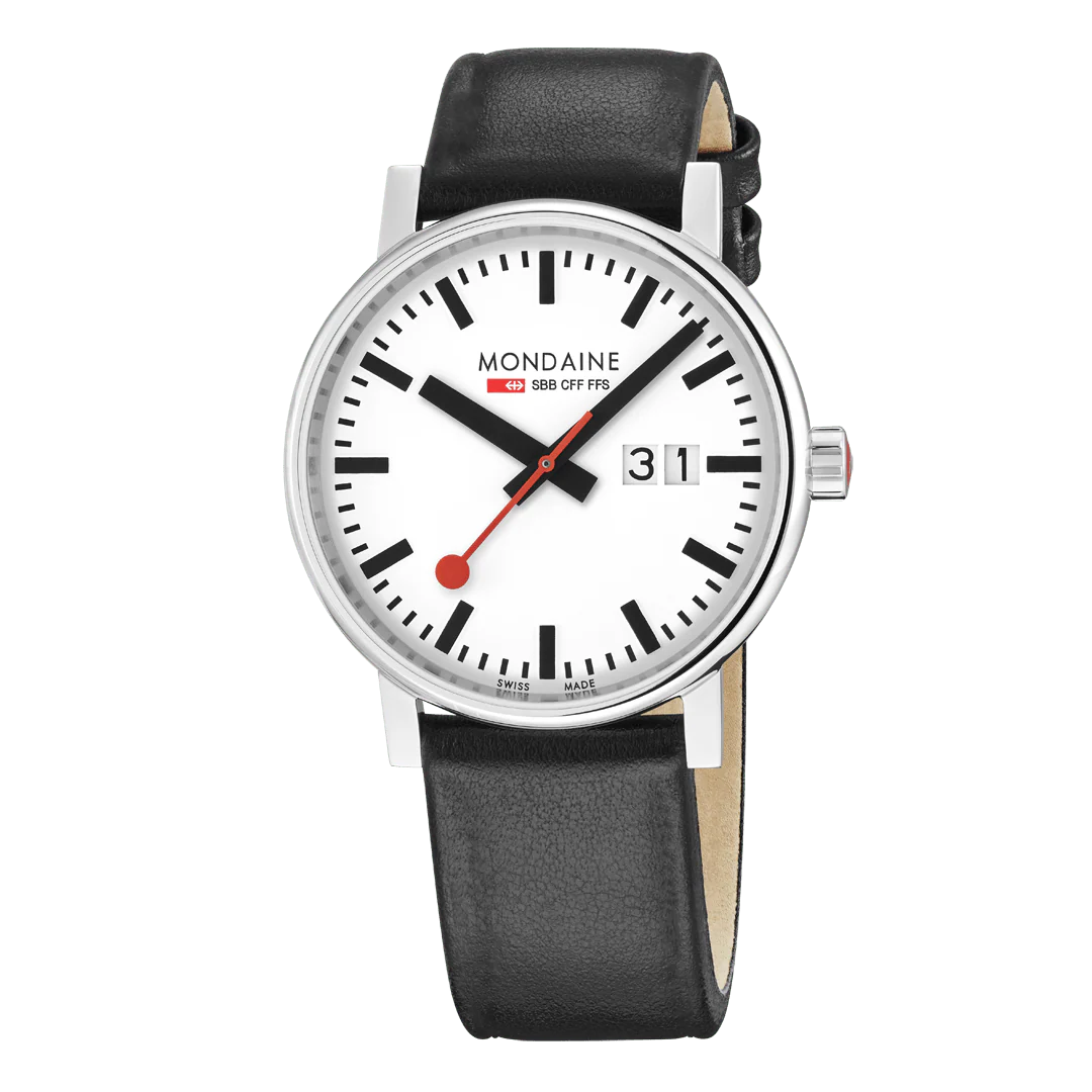 Evolutionäres Design. Das harmonisch geformte Gehäuse aus poliertem Edelstahl der Mondaine Official Swiss Railways evo2 verspricht höchsten Tragekomfort. Das ikonische Design dieser klassischen Uhr zeichnet sich durch die gute Ablesbarkeit des Zifferblattes aus, was mit der grossen Datumsanzeige abgerundet wird. Die Uhr hat ein schwarzes veganes Lederarmband. Letzteres besteht zu 75% aus pflanzlichem Öko-Verbundmaterial und zu 25% aus recyceltem PET.