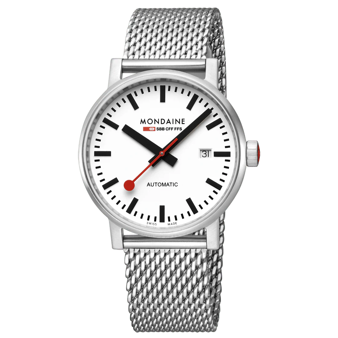 Evolution der Automatik. Die Automatikuhr mit unserem legendären evo2 Gehäuse präsentiert sich in einem puristisch, harmonischem Design. Die abgerundete Form des 40 mm Gehäuses aus poliertem Edelstahl trägt zum hohen Tragekomfort dieses Zeitmessers bei. Ein echtes Design-Highlight ist der transparente Gehäuseboden, durch den das komplexe Automaten Uhrwerk zu sehen ist. Das ikonische Mondaine Zifferblatt mit Datumsanzeige und das elegante Milanaise-Mesh-Band runden die Uhr perfekt ab.