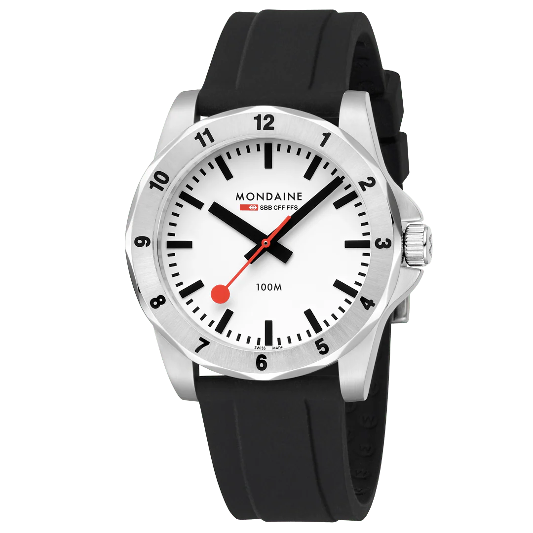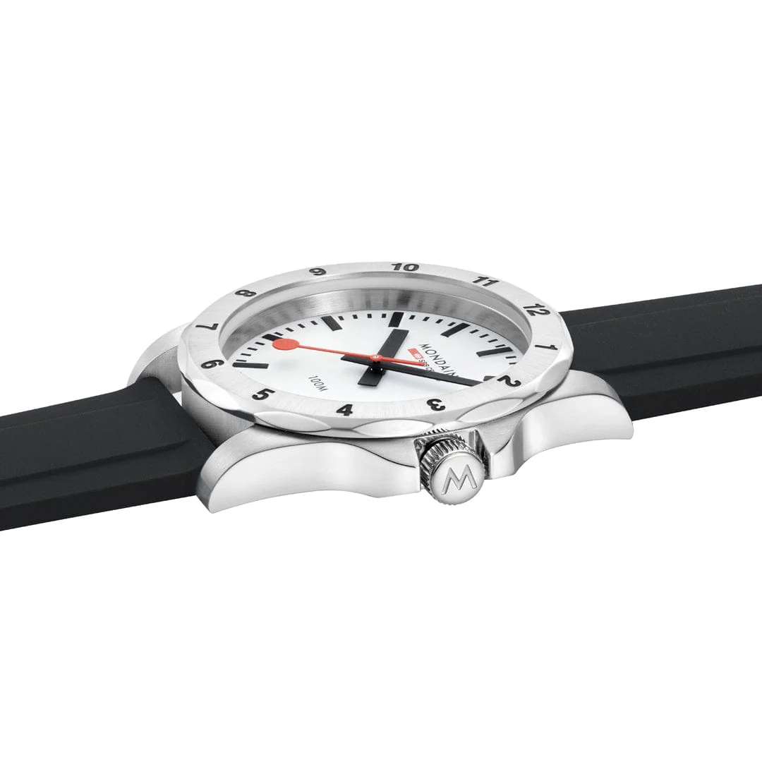 Die beeindruckende Numeri Uhr verfügt über ein 42 mm Edelstahlgehäuse mit einer markanten 12-eckigen Lünette. Die geometrische, mit Ziffern versehene Lünette verbessert die Ablesbarkeit und wird zu einem interessanten Designelement. Das klassische weisse Zifferblatt mit dem ikonischen roten Sekundenzeiger sorgt für mühelose Ablesbarkeit. Auch das entspiegelte Saphirglas und die BackLight-Technologie sorgen für optimale Sicht in allen Lichtverhältnissen. Das robuste Gehäuse mit brossierten und polierten Oberflächen wird mit einem passenden Edelstahl-Gliederarmband kombiniert. Diese Swiss Made Uhr ist bis zu 10 ATM wasserdicht und kann sowohl im Büro als auch für jedes Outdoor-Abenteuer getragen werden.