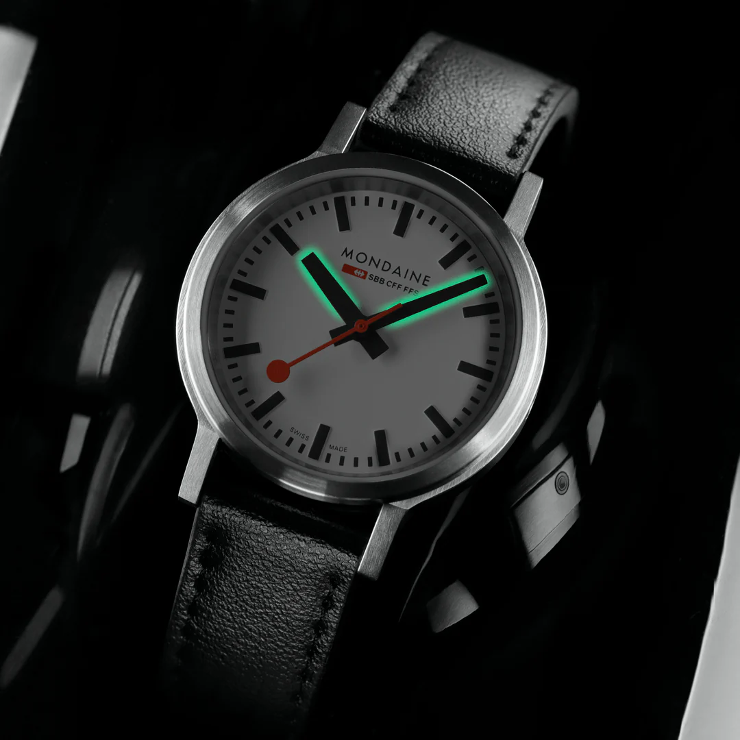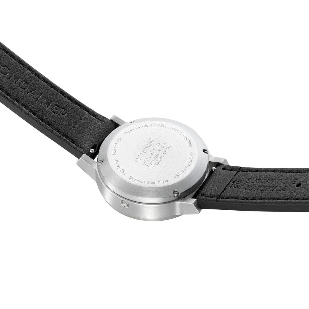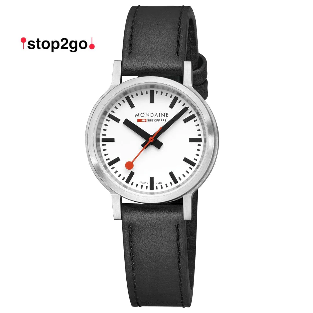 Die stop2go Uhr ist eine Hommage an die ikonische Bahnhofsuhr der Schweizerischen Bundesbahnen. Das auffallend robuste Design zeichnet sich durch ein Gehäuse ohne Krone und einen klassischen Look aus. Das weiße Zifferblatt und das 34 mm Gehäuse aus brossiertem Edelstahl werden mit einem schwarzen, veganen Traubenlederarmband kombiniert. Ausgestattet mit dem exklusiven und einzigartigen Swiss Made stop2go Uhrwerk, das dem der Schweizerischen Bundesbahnen nachempfunden ist, verfügt sie über einen 2-Sekunden-Stopp. Die Uhr ist außerdem mit der patentierten BackLight-Technologie, die die Unterseite der Zeiger leuchten lässt und das Ablesen der Uhrzeit im Dunkeln ermöglicht, ausgestattet. Die Uhr wird mit einem Zeiteinstellstift geliefert, mit dem sich die Zeit leicht einstellen und die Zeiger ausrichten lassen.
