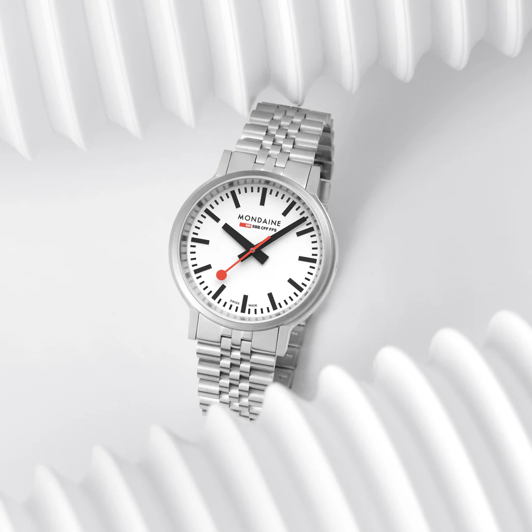 Die stop2go Uhr ist eine Hommage an die ikonische Bahnhofsuhr der Schweizerischen Bundesbahnen. Das auffallend robuste Design zeichnet sich durch ein Gehäuse ohne Krone und einen maskulinen Look aus. Das klassische, weiße Zifferblatt und das 41mm Gehäuse aus brossiertem Edelstahl werden mit einem Edelstahlarmband kombiniert. Ausgestattet mit dem exklusiven und einzigartigen Swiss Made stop2go Uhrwerk, das dem der Schweizerischen Bundesbahnen nachempfunden ist, verfügt sie über einen 2-Sekunden-Stopp. Die Uhr ist außerdem mit der patentierten BackLight-Technologie, die die Unterseite der Zeiger leuchten lässt und das Ablesen der Uhrzeit im Dunkeln ermöglicht, ausgestattet. Die Uhr wird mit einem Zeiteinstellstift geliefert, mit dem sich die Zeit leicht einstellen und die Zeiger ausrichten lassen.